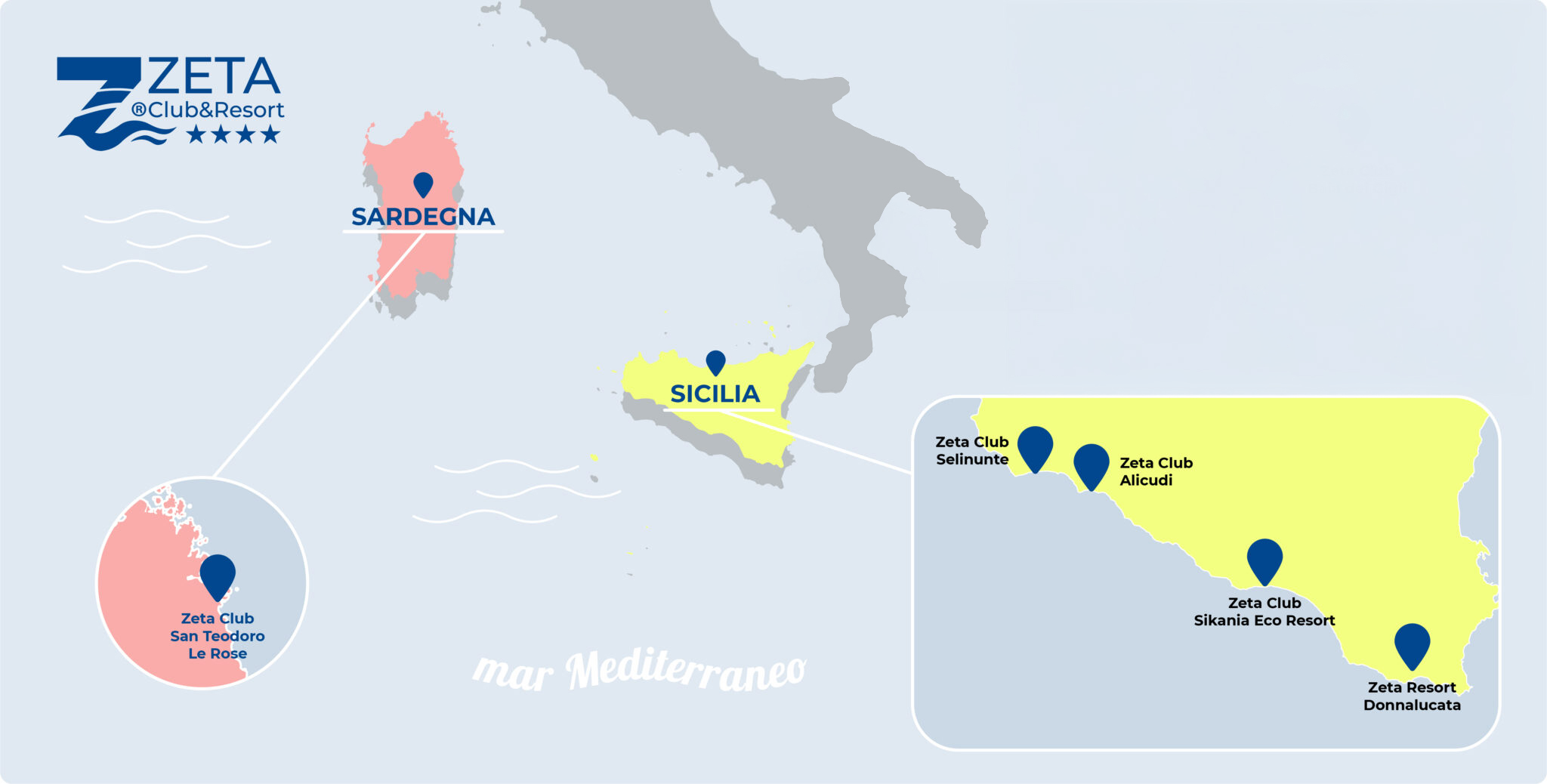Zeta Club&Resort® è un’esperienza firmata Isola Azzurra Tour Operator. Offriamo un’ospitalità che parte dal momento della prenotazione e ti guida in un viaggio unico tra hotel, animazione, spettacoli e scoperta del territorio. I nostri club e resort esclusivi rispondono a una domanda sempre più variegata, con soluzioni di vacanza pensate per ogni tipo di ospite: dalle famiglie che cercano relax e divertimento, ai viaggiatori più esigenti, desiderosi di vivere un’esperienza diversa, dinamica e immersa nel panorama, nella cucina e nella cultura locale, il tutto senza mai rinunciare al comfort e alla leggerezza di un soggiorno in villaggio. Un concept in continua evoluzione!